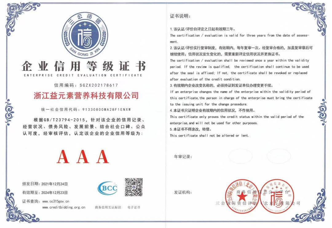 信用是企业发展的根本。浙江益元素营养科技有限公司自成立以来,高度重视企业信用管理工作,2021年12月24日被评为“企业信用评价AAA级信用企业”,这是国内企业信用的最高等级评价,标志着益元素在企业信用建设方面取得了实质性的成果,代表着益元素“软实力”和“信誉度”的进一步提升,进一步展现了公司诚信建设和信用管理能力水平,为提升公司品牌影响力增添了新的砝码。