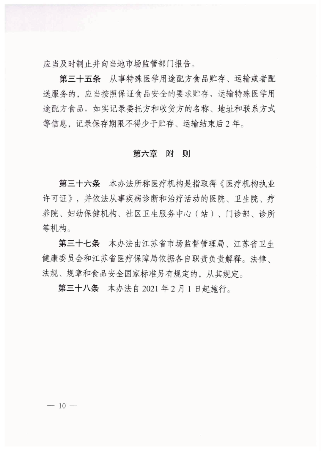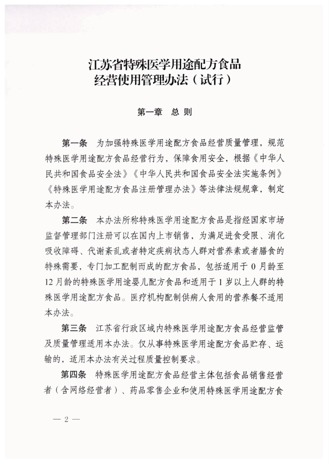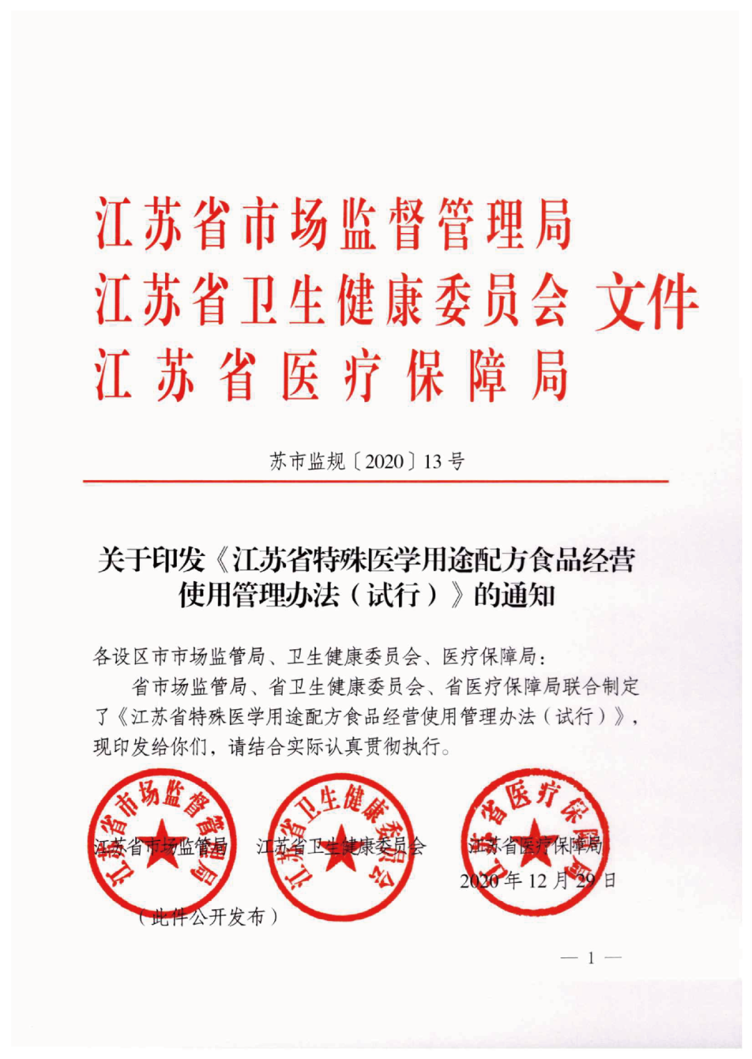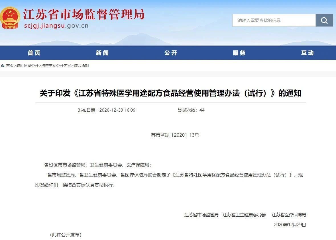 2020年12月29日,江苏省市场监管局、江苏省卫生健康委员会、江苏省医疗保障局联合发布《江苏省特殊医学用途配方食品经营使用管理办法(试行)》,这是继济南市、湖北省后又一省级特医食品应用规范出台。《办法》在规范特医食品经营管理、助力健康产业发展,积极推动特医食品应用于临床治疗,让更多人获得专业营养关怀的同时,对其他各省制定相关管理规范具有参考意义。