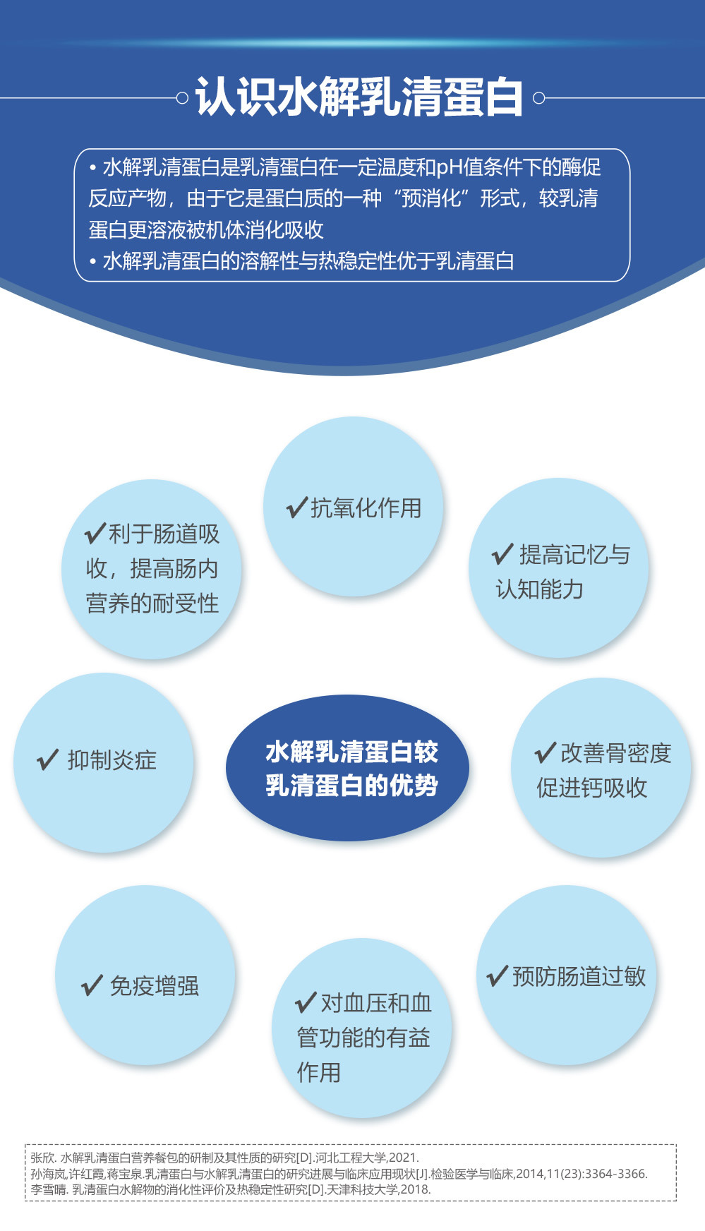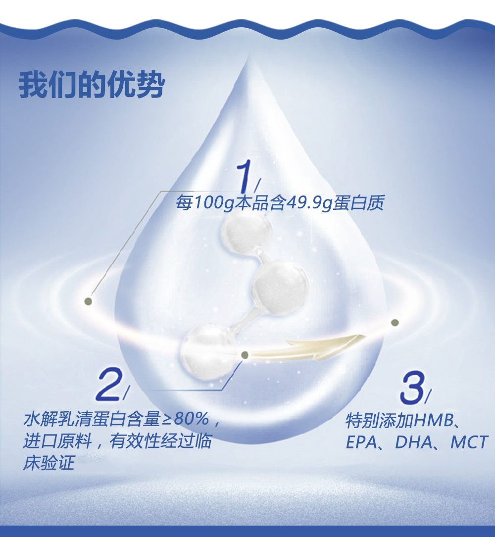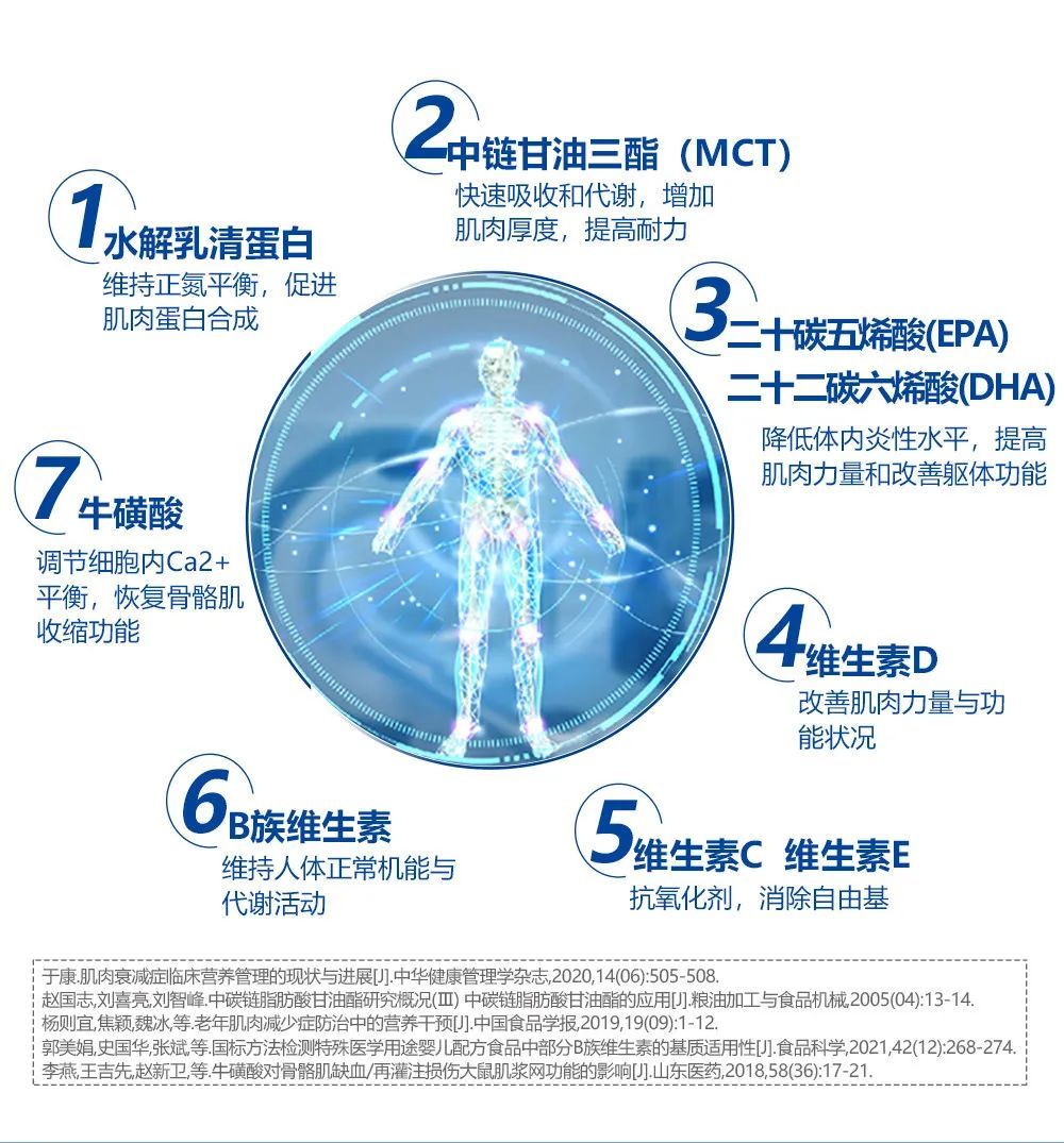其实,蛋白质补充也有很多学问,对于肌肉衰减症、免疫力低下等人群,一般推荐乳清蛋白、大豆蛋白等优质蛋白,因为优质蛋白中含有的各种氨基酸种类和比值更接近于人体内的蛋白质氨基酸组成,易于被人体消化吸收。然而对于胃肠道功能较差的老年人群,水解乳清蛋白可能是更好的选择,因为水解乳清蛋白以短肽形式存在,较乳清蛋白更容易被人体消化吸收,同时它还具有改善机体代谢紊乱、增强免疫以及延缓衰老等特点;近年来,研究证明,水解乳清蛋白不仅可以改善骨密度、促进钙的吸收,还具有调节血压与血管功能的作用[11-12]。