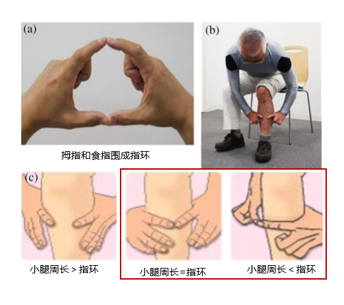 还有一种替代小腿围的有效方法,被称为“指环测试”,即用双手的食指和拇指环绕围住小腿最厚的部位,如果测量到的小腿刚好合适或比指环小,患肌肉衰减症的风险就会增加,建议及时就医。