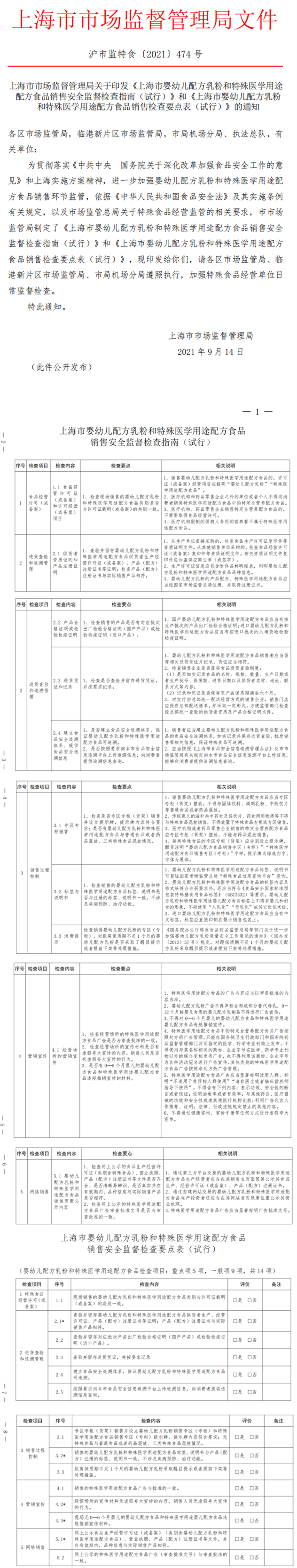 10月8号,上海市市场监督管理局关于印发《上海市婴幼儿配方乳粉和特殊医学用途配方食品销售安全监督检查指南(试行)》和《上海市婴幼儿配方乳粉和特殊医学用途配方食品销售检查要点表(试行)》的通知