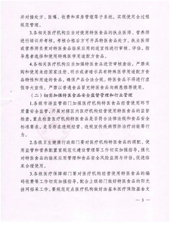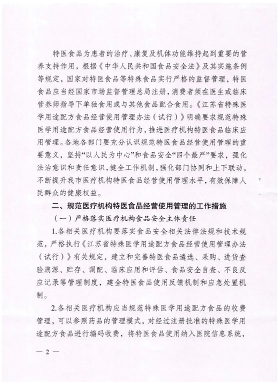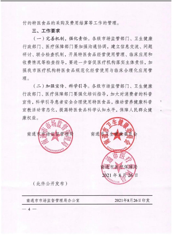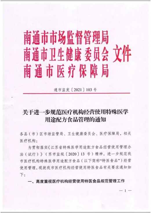 2021年8月26日为贯彻落实《江苏省特殊医学用途配方食品经营使用管理办法(试行)》(苏市监规(2020)13号 )精神,进一步规范南通市医疗机构特殊医学用途配方食品(以下 简称“特医食品”)经营使用管理。江苏省南通市市场监管管理局、南通市卫生健康委员会、南通市医疗保障局联合发布《关于进一步规范医疗机构经营使用特殊医学用途配方食品管理的通知》。下附全文: